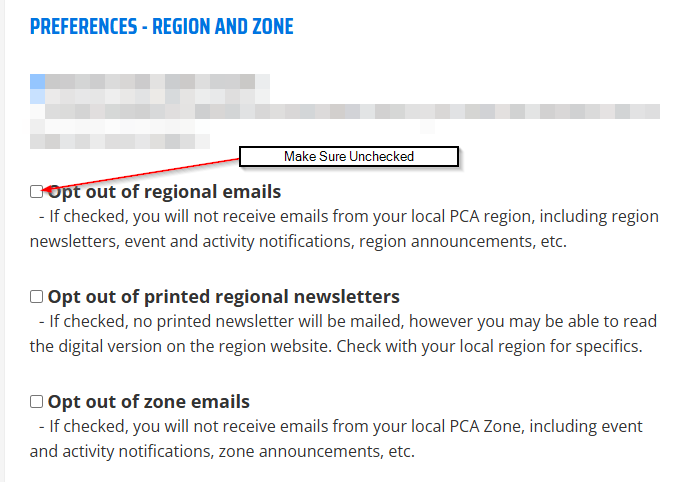 4. Scroll down to “Preferences – Region and Zone” and ensure that “Opt out of regional emails” is not checked.